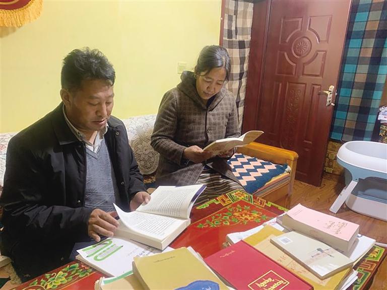 頓珠和兒子一起看書(shū)。 頓珠和妻子一起看書(shū)。圖由受訪者提供