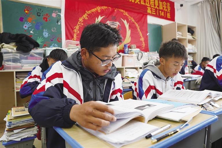 高三教學(xué)樓,遠(yuǎn)遠(yuǎn)便聽見教室里傳來的朗朗書聲。課堂上,老師正耐心細(xì)致地講解著習(xí)題,同學(xué)們時而認(rèn)真聽講、奮筆疾書,時而相互討論、請教老師……大家神情堅毅、目光堅定,在各自的一方天地里埋頭苦學(xué),以最專注的態(tài)度為即將到來的人生大考做著準(zhǔn)備。“今年我們學(xué)校有660余名高三學(xué)生,現(xiàn)在大家都在進(jìn)行最后的沖刺,隨后還會進(jìn)行一次模擬考試。”拉薩江蘇實(shí)驗(yàn)中學(xué)高三年級部副主任張姣姣告訴記者,“今年是新課改的第一年,各學(xué)科老師都在盡心盡力幫助同學(xué)們查漏補(bǔ)缺,合理安排最后沖刺階段的學(xué)習(xí)時間,確保同學(xué)們能夠從容自信地踏入考場?!?/p>