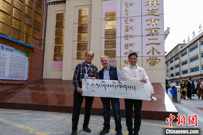 圖為5月18日,柯馬凱(左一)在林芝市第二小學(xué)參訪時(shí)獲得學(xué)校贈(zèng)予的藏文書(shū)法作品“扎西德勒”。 中新社記者 江飛波 攝