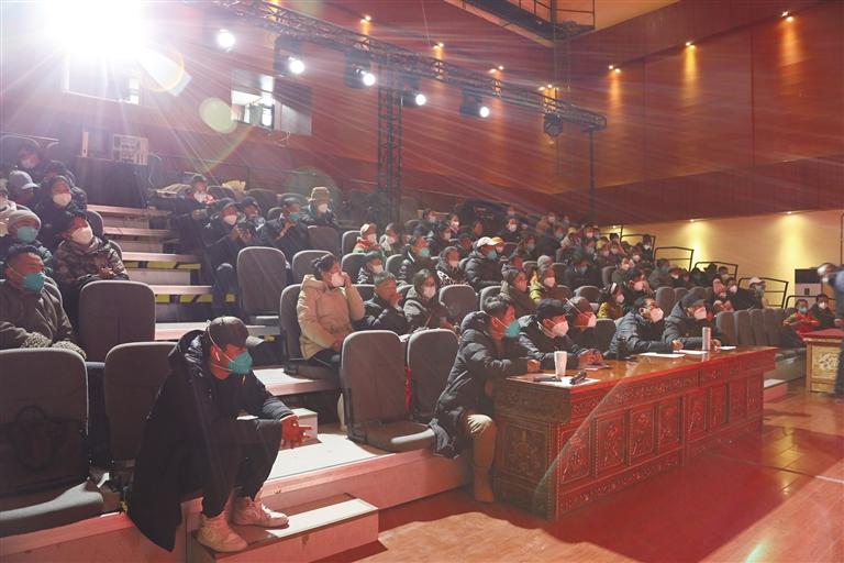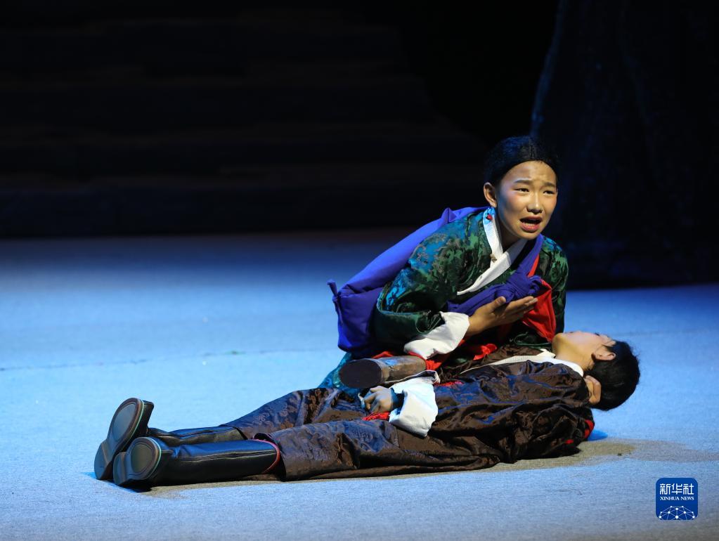 13歲的小演員旦增夢(mèng)朗身著深綠色藏戲服飾,跪在舞臺(tái)中央,眼角噙淚,緊摟著失去意識(shí)的弟弟……低沉、哀慟的藏戲唱腔,舞臺(tái)兩側(cè)實(shí)時(shí)滾動(dòng)的字幕,看哭了不少觀看試演的觀眾。