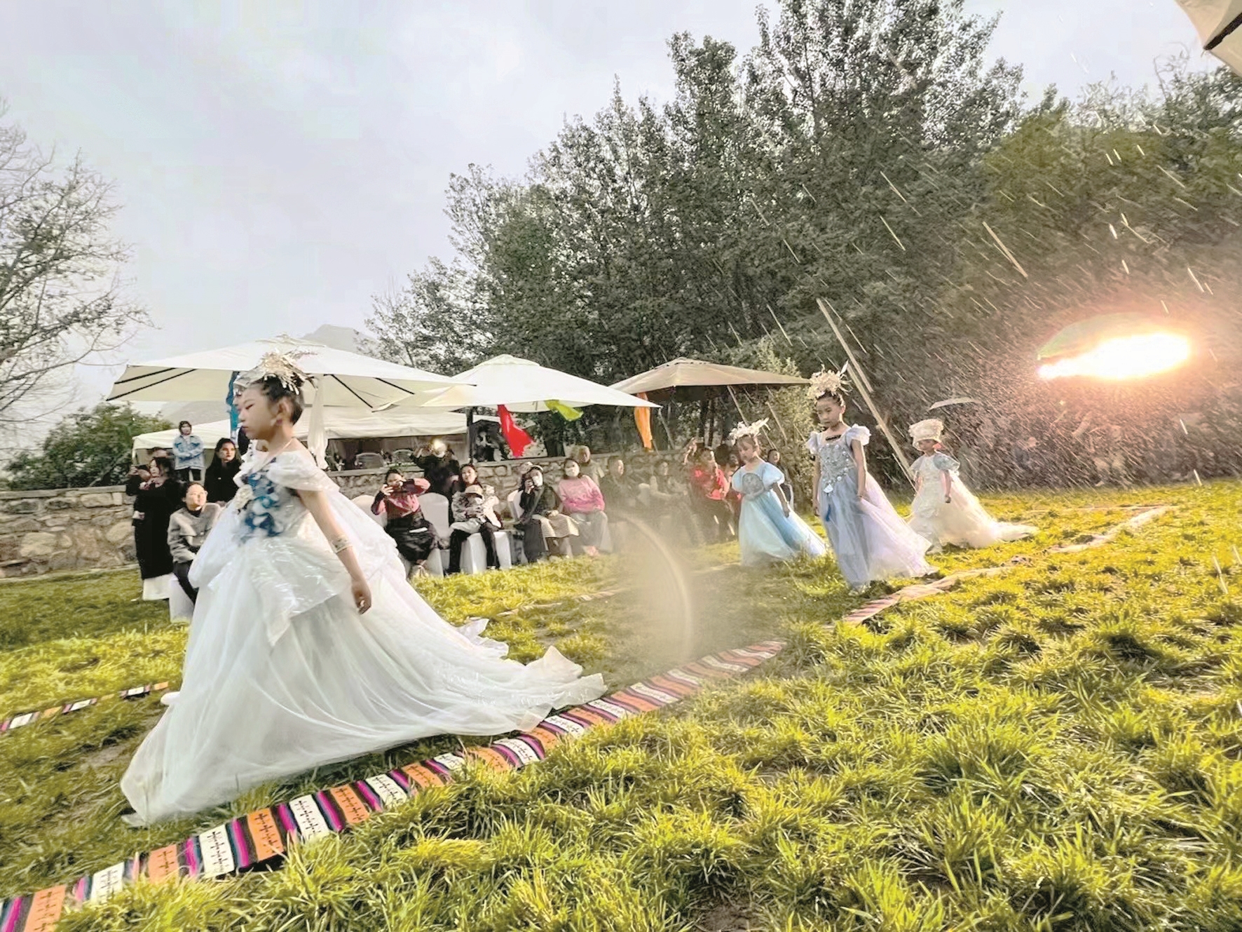 模特秀上,盡管天公不作美下起了雨,但小模特們跟隨著動(dòng)感十足的韻律在雨中自信走秀,燃爆全場(chǎng),極具個(gè)性色彩的藏族與苗族服裝展現(xiàn)了傳統(tǒng)文化與時(shí)尚設(shè)計(jì)的交相輝映,凸顯出“傳統(tǒng)與新潮”的極度融合,體現(xiàn)了“各美其美,美美與共”的文化關(guān)聯(lián)。