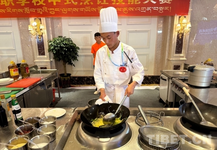 圖為來(lái)自昌都市職業(yè)技術(shù)學(xué)校的參賽選手旦增羅布在炒菜攝影:旦曲