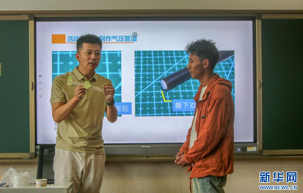 在《航空模型制作》課上,北京市少年宮科技教學(xué)部教師張文龍(左)正在與拉薩本地教師進(jìn)行互動(8月23日攝)。新華社記者 邵澤東 攝