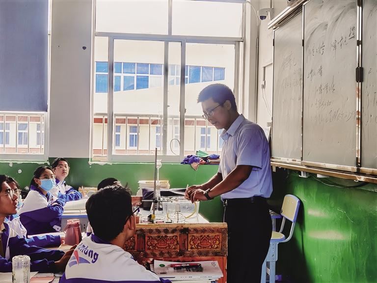 “李老師非常平易近人、和藹可親,他會(huì)帶著我們做化學(xué)實(shí)驗(yàn),在實(shí)驗(yàn)中可以了解到很有趣的知識(shí),讓我們更加快樂地學(xué)習(xí)。”拉薩市第八中學(xué)九年級(jí)二班的同學(xué)們表示,李老師關(guān)心每個(gè)人的學(xué)習(xí)狀況,如果有人在考試中表現(xiàn)不佳,李老師會(huì)親自講解,并在試卷上標(biāo)注出需要改正的錯(cuò)誤。下課后,李老師也會(huì)認(rèn)真傾聽學(xué)生們的想法和感受,與孩子們互動(dòng)交流。