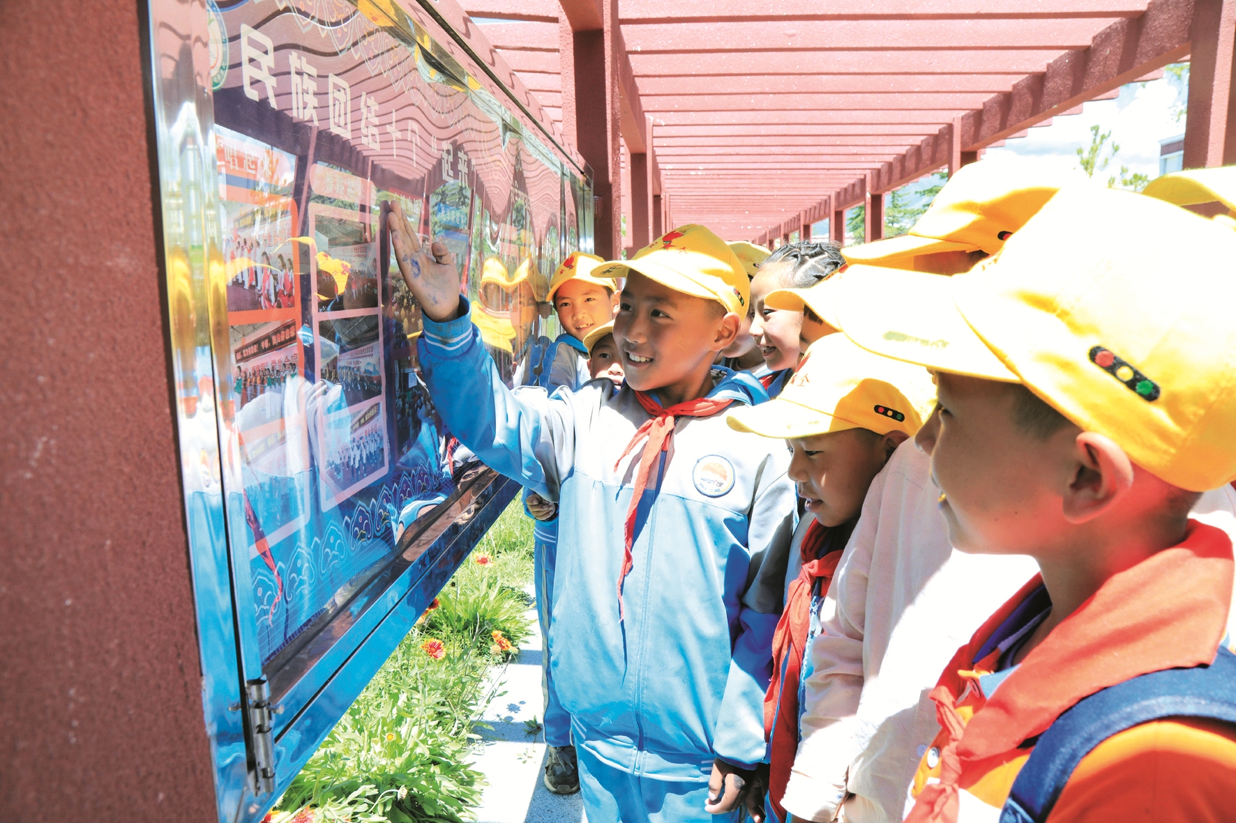 伴隨著初秋的陽光,記者一行驅(qū)車來到了墨竹工卡縣南京實(shí)驗(yàn)小學(xué)。上午11時(shí),剛跳完民族健身操的學(xué)生們正陸陸續(xù)續(xù)回到教室里準(zhǔn)備迎接第三節(jié)課的到來。沿著教學(xué)樓往西走大概50米,便可以看到標(biāo)有“民族團(tuán)結(jié)教育主題公園”的主題苑。記者在參觀中了解到,該校前期通過積極協(xié)調(diào)有關(guān)部門,于2022年創(chuàng)建了該主題苑。設(shè)立在學(xué)生宿舍與教學(xué)樓之間的主題苑里,展示著民族團(tuán)結(jié)宣傳標(biāo)語、民族團(tuán)結(jié)文化墻以及民族團(tuán)結(jié)宣傳欄等,形成了濃厚的民族團(tuán)結(jié)宣傳氛圍。為使民族團(tuán)結(jié)的種子更深地播種在學(xué)生心底,學(xué)校還培養(yǎng)了一批學(xué)生講解員定期組織學(xué)生開展參觀講解活動(dòng)。來自四年級(jí)(4)班的強(qiáng)巴曲吉便是講解員之一。