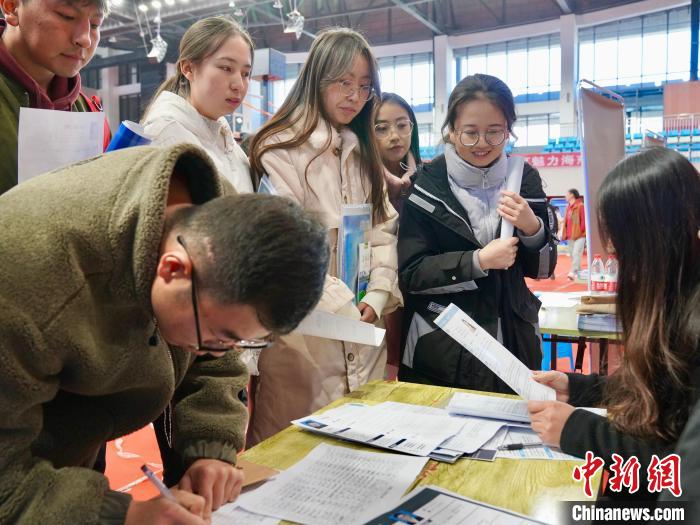 圖為招聘會(huì)現(xiàn)場(chǎng),畢業(yè)生正在填寫(xiě)信息。 劉洋 攝