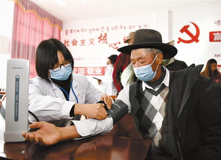 圖為拉薩市青年志愿救援隊的醫(yī)護人員為群眾測量血壓。記者 旦增蘭澤 攝