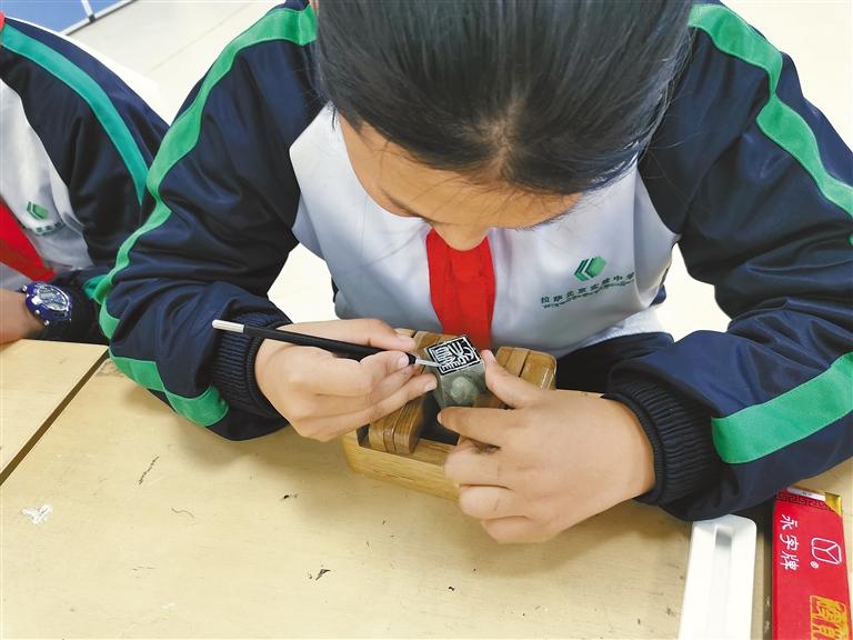 圖為學(xué)生學(xué)習(xí)篆刻技法。