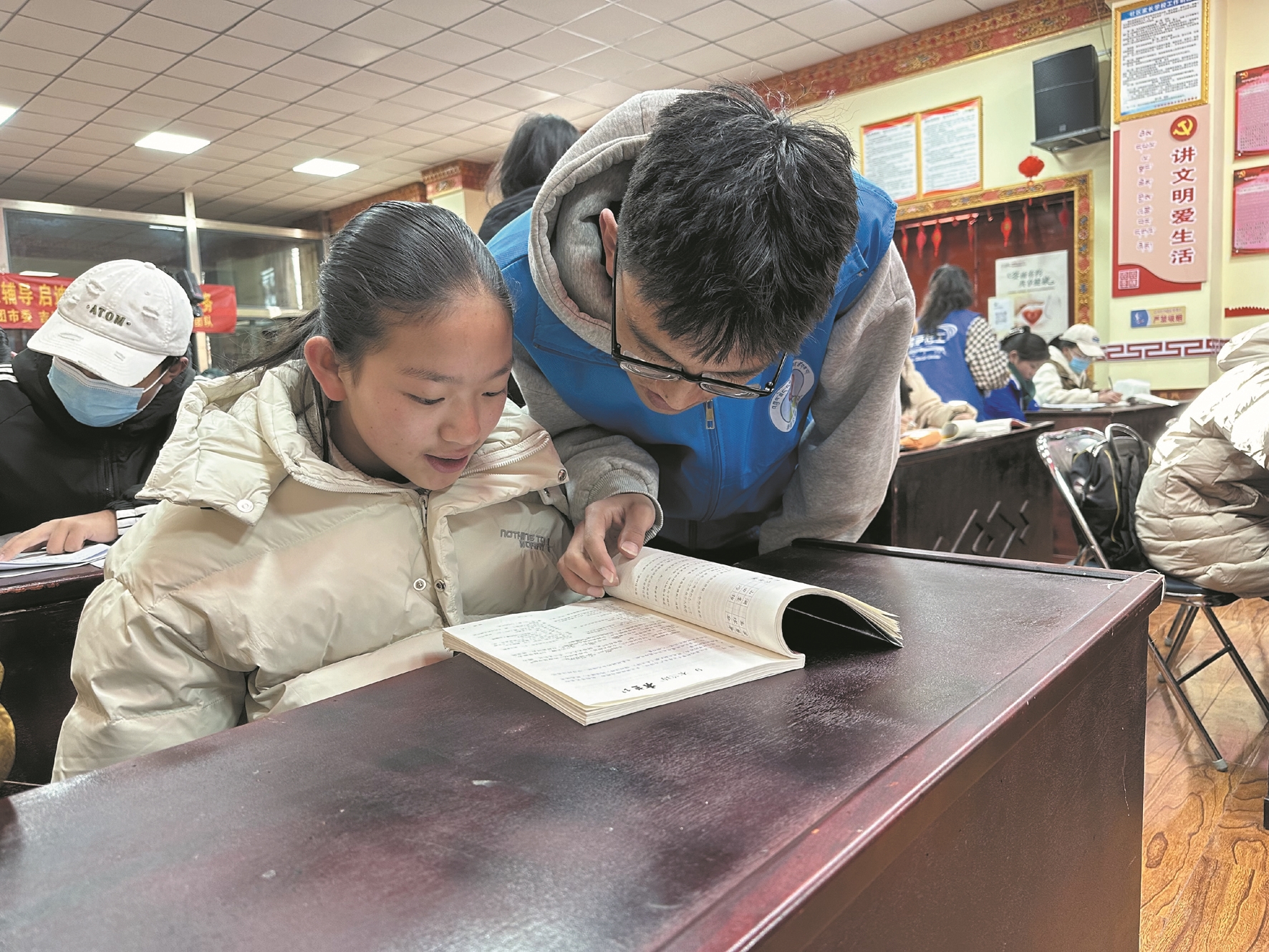 寒假期間,不少家長因為沒辦法輔導孩子的日常學習而感到苦惱。前不久,吉崩崗街道聯(lián)合市團委、摯善公益團隊在熱木其社區(qū)居委會里設(shè)立了一個臨時“教室”,為轄區(qū)孩子們提供為期一個月的課業(yè)輔導志愿服務?,F(xiàn)場,返鄉(xiāng)大學生志愿者們變身為一名名“小老師”,耐心幫助孩子們解決學習難題,輔導的課業(yè)涵蓋了小學、初中的所有科目。除了教作業(yè),志愿者還組織孩子們開展演講比賽、書法比賽等活動,充實了孩子們的假期生活。