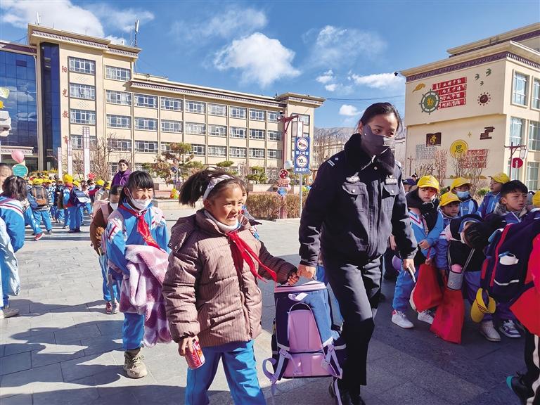 站在學校門口,等待孩子的家長央金感觸頗深,她告訴記者,每次開學前、開學時、開學后,都能看到民警們忙碌的身影。為學校家長提供幫助,為學生消除安全隱患,營造了安全、和諧、文明的校園環(huán)境,十分感謝他們?!敖裉靾蟮嚼?,我們看到警察叔叔和阿姨就覺得很安心、很開心?!睂嶒炐W3年級10班學生白瑪娜薩說。