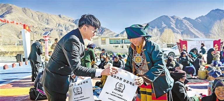 德薩村駐村工作隊隊員為群眾發(fā)放法治宣傳物品。張夢琦 記者 扎西頓珠 攝