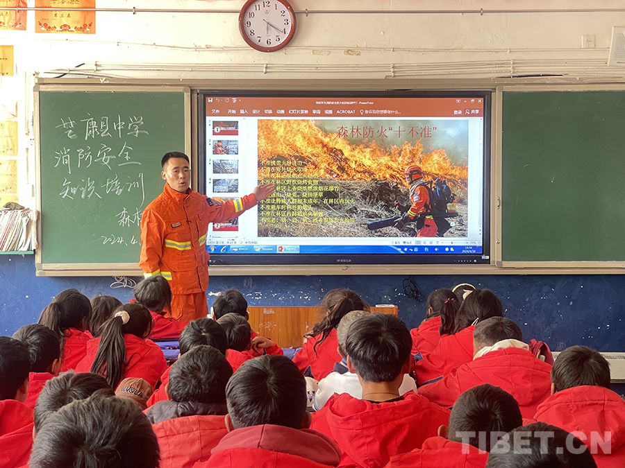 在芒康縣中學(xué)授課現(xiàn)場,芒康縣森林消防分隊負責(zé)人夏能向全校師生講解森林防火的重要意義、火災(zāi)的起因、相關(guān)法律法規(guī)和常用防火知識等,教育引導(dǎo)同學(xué)們樹立森林防火意識,做到不帶火種進山,發(fā)現(xiàn)火情及時報警。