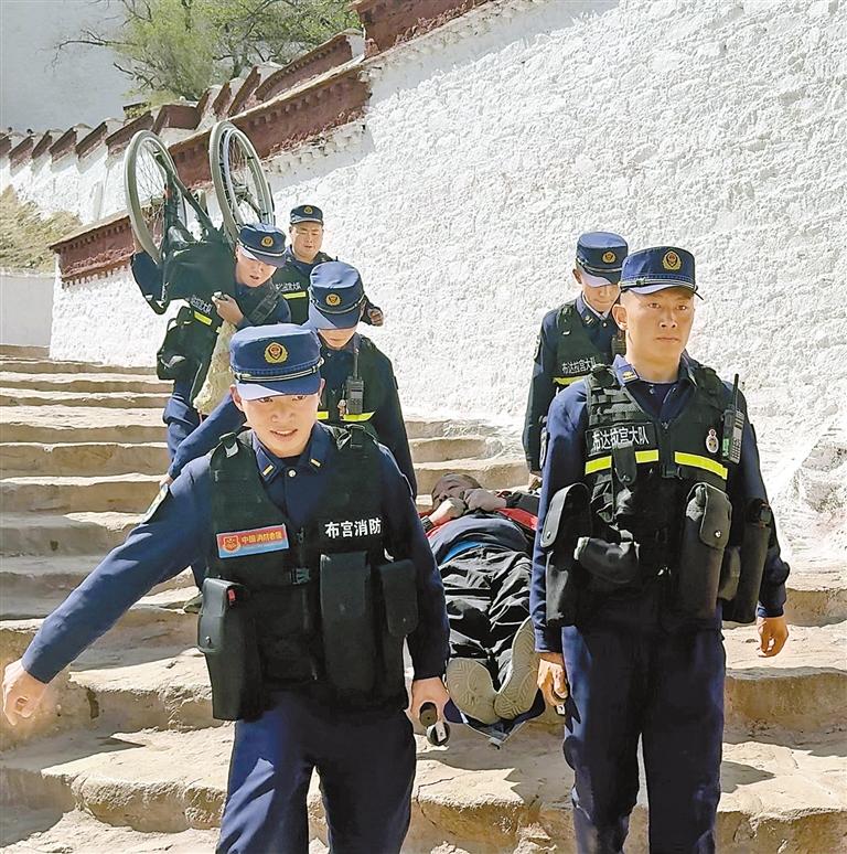 消防指戰(zhàn)員背負(fù)殘障游客游覽布達(dá)拉宮。 肖暄 攝