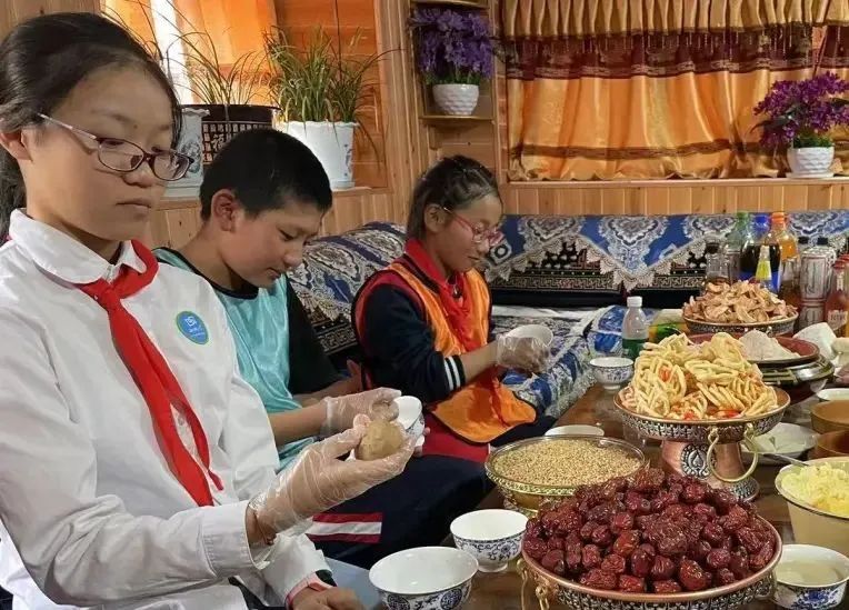 在“藏家”融情交流中,各地少先隊員在農(nóng)家一起學(xué)習(xí)制作西藏傳統(tǒng)美食糌粑、卡塞等,一個個極具創(chuàng)意造型的“小卡塞”,精致巧妙,隊員們共學(xué)、共樂、共享,體悟藏家民族風(fēng)俗,沉浸在歡樂的氛圍中?!皡⒓哟舜沃黝}隊會交流活動我非常開心,深度體驗了‘藏家’民俗,看到祖國邊疆鄉(xiāng)村的小康生活,豐富的活動讓我增強(qiáng)了對中華民族優(yōu)秀文化的認(rèn)同感和自豪感,我要繼續(xù)爭做小石榴籽,切實鑄牢中華民族共同體意識”來自重慶市璧山區(qū)劍山實驗小學(xué)五(3)中隊隊員李思穎表示。