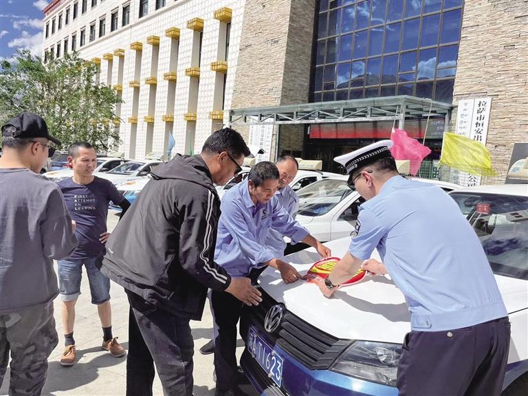 拉薩市恒安出租車有限公司工作人員正在張貼送考標志。