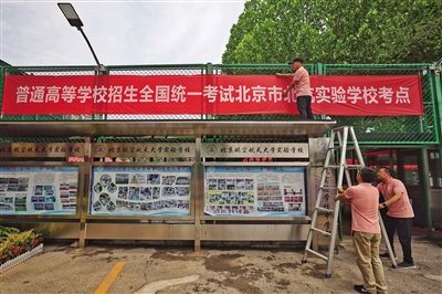 6月6日,記者在北京航空航天大學(xué)實(shí)驗(yàn)學(xué)校中學(xué)部(簡(jiǎn)稱(chēng)“北航實(shí)驗(yàn)學(xué)?!保┛键c(diǎn)看到,學(xué)校西門(mén)處已懸掛起高考考點(diǎn)橫幅、考場(chǎng)布置已就位,校園內(nèi)放置了多個(gè)溫馨的提示語(yǔ)標(biāo)牌。據(jù)悉,該校是今年新增高考考點(diǎn)之一,承接來(lái)自9所學(xué)校277名考生的高考組考任務(wù)。此外,記者還探訪了北京高考人大附中經(jīng)開(kāi)學(xué)??键c(diǎn)