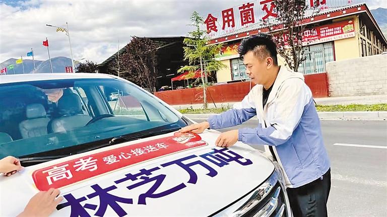 圖為愛(ài)心車車主在張貼“愛(ài)心送考車”貼紙。