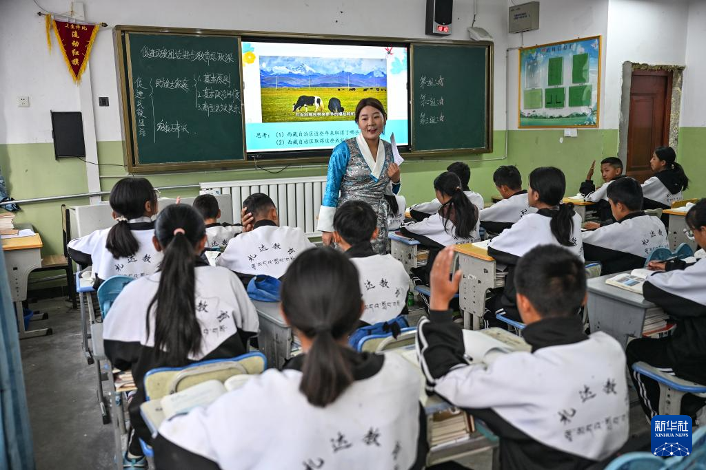 在西藏阿里地區(qū)札達(dá)縣九年一貫制學(xué)校,老師次仁曲加給初三(2)班的學(xué)生上課(9月10日攝)。新華社記者 孫瑞博 攝
