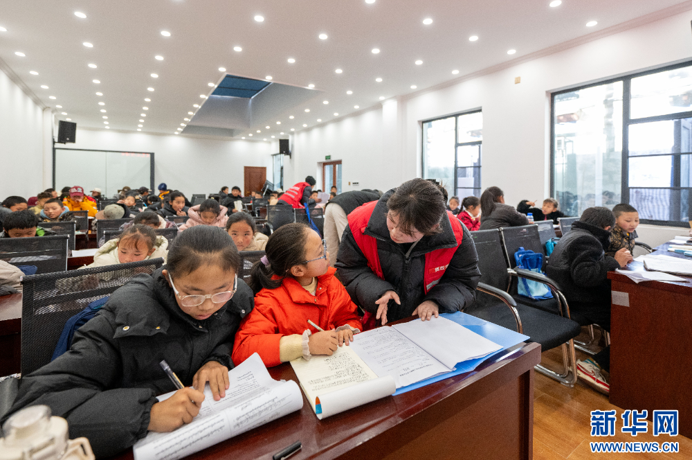 1月16日,社區(qū)工作人員在輔導作業(yè)。新華網 旦增努布 攝