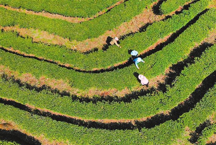 氣溫回暖,蟄伏了一個冬天的春茶早已迫不及待地吐出新綠。一片片小小的茶葉是村民手中的“金葉子”,一壟壟整齊的茶園成為當(dāng)?shù)厝罕姷摹熬蹖毰琛?,它們撐起了農(nóng)民增收、農(nóng)村富裕、脫貧攻堅(jiān)的一方天地。