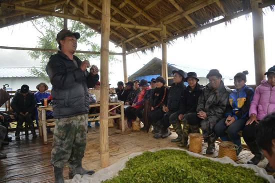 雨越下越大,格桑把村民們叫到茶葉基地旁邊的茅草屋避雨,借此機會,他又用門巴語講解了民族團結、掃黑除惡、醫(yī)療報銷等方面的內容,這中間還穿插一些漢語的講解。