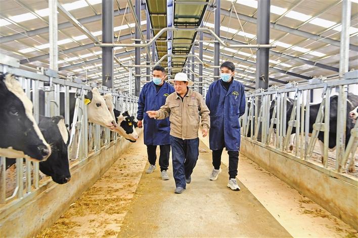 圖為近日,達(dá)孜區(qū)高標(biāo)準(zhǔn)良種奶牛養(yǎng)殖示范中心畜牧獸醫(yī)姜玉亮帶領(lǐng)新員工巡檢牛場(chǎng)。記者 李洲 攝