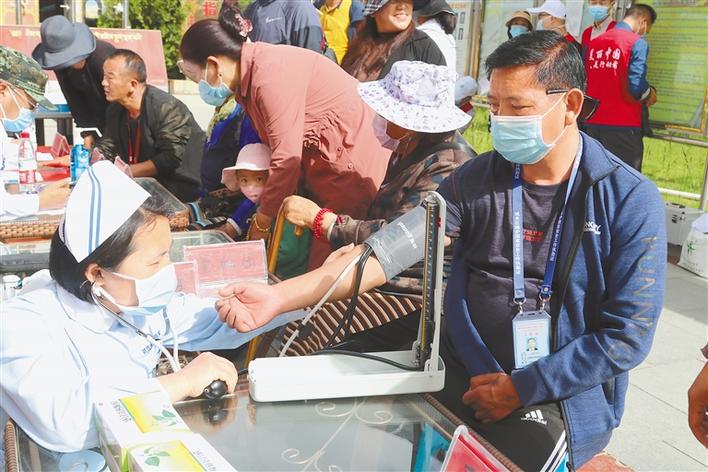 圖為武警西藏總隊醫(yī)院醫(yī)護人員為社區(qū)居民測量血壓。 金言 蔣長春 攝