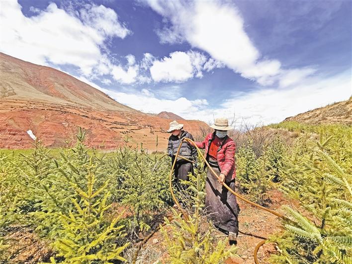 西藏昌都市丁青縣覺恩鄉(xiāng)絨通村苗木種植項(xiàng)目總投資2000萬元,采取“公司+基地+農(nóng)戶”的運(yùn)作模式。2018年底,基地開工建設(shè),93戶農(nóng)戶以每畝每年1000元的價格參與500畝的土地流轉(zhuǎn),項(xiàng)目實(shí)施階段共計880人次的貧困戶參與了務(wù)工。至2019年6月,已成功栽下云杉、昌都楊、柳樹、榆樹4個品種,共計97萬株樹苗。目前,在基地長期務(wù)工的村民有8名,年收入近2萬元。