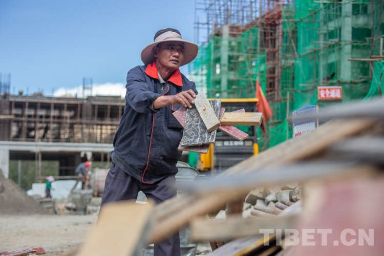 圖為西藏自治區(qū)山南市隆子縣隆子鎮(zhèn)扎果村村民旺堆在隆子縣日當(dāng)鎮(zhèn)宗那建筑有限公司正在建設(shè)中的祿東贊大酒店工作攝影:趙耀