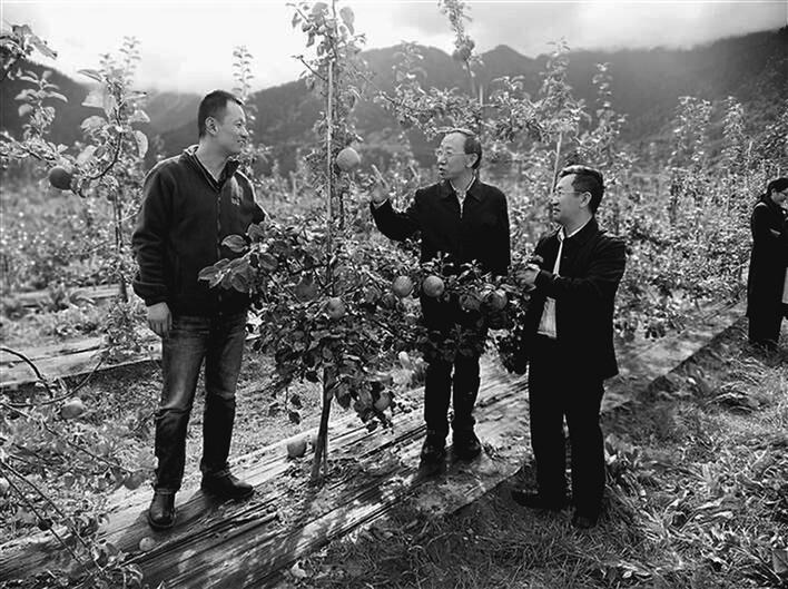 國家蘋果產(chǎn)業(yè)技術體系首席科學家霍學喜(中)在米林縣羌納蘋果示范基地現(xiàn)場開展技術指導。西藏日報記者 李梅英 攝