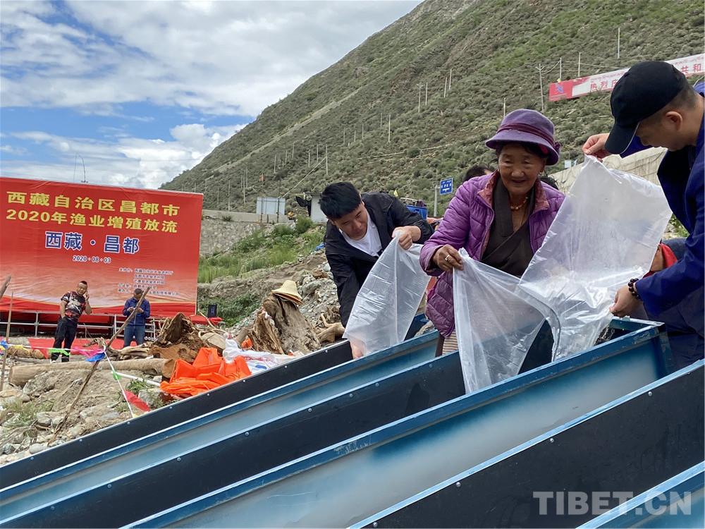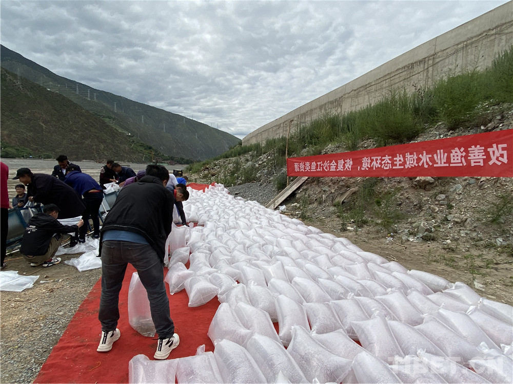 在工作人員協(xié)助下,老阿媽把一袋袋魚(yú)苗放入江中。據(jù)老阿媽說(shuō),當(dāng)年十八軍進(jìn)藏路過(guò)這里,帶的糧食不多,他們不向當(dāng)?shù)厝苏骷Z,有些人餓得浮腫。江河中的魚(yú)兒好抓,但沒(méi)有一個(gè)戰(zhàn)士違反紀(jì)律去抓魚(yú)。藏族敬畏魚(yú),不捕魚(yú),不吃魚(yú)。解放軍尊重當(dāng)?shù)仫L(fēng)俗,即使餓死也不抓魚(yú)充饑。