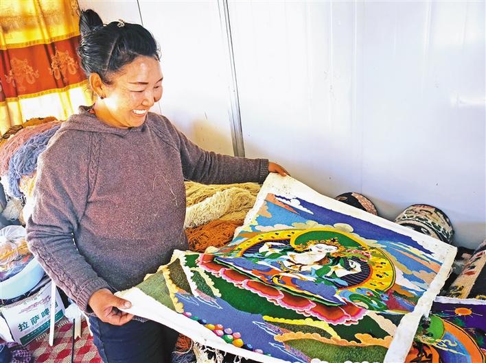 西藏日喀則市易地扶貧搬遷點群眾展示自己的藏繡作品。[詳細(xì)]
