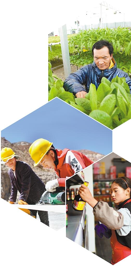 ?、僭诟翣柨h生態(tài)農(nóng)業(yè)產(chǎn)業(yè)園內(nèi),噶爾縣左左鄉(xiāng)上左左村村民宿加在查看蔬菜生長情況。 ②八宿縣擁巴鄉(xiāng)村民格松旺扎(右)在八宿縣西巴村小型磚廠里忙碌。 ③丁青縣尺牘鎮(zhèn)烏巴村村民斯朗德吉在尺牘鎮(zhèn)的一家超市里打工。新華社記者 詹彥 攝
