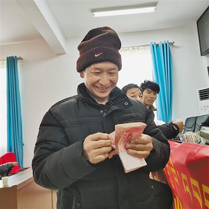 圖為卡瑪村村民斯塔次旦在合作社開(kāi)心地?cái)?shù)著自己的分紅和工資。記者 曲珍 萬(wàn)靖 攝