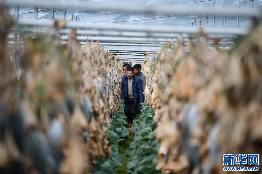 陳千(前)和種植戶在大棚里查看蔬菜長勢(2月25日攝)。新華社記者 晉美多吉 攝