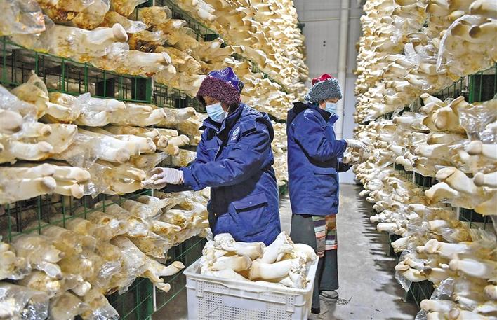 日喀則市珠峰一見(jiàn)則喜生物科技示范園區(qū)內(nèi)工作人員在采摘杏鮑菇。