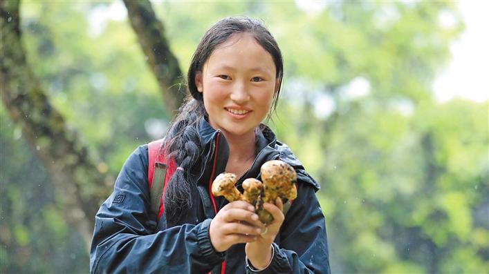 圖為尼屋鄉(xiāng)村民德珍從山里采摘了大量松茸,臉上洋溢著豐收的喜悅。記者 萬靖 謝偉 曲珍 攝