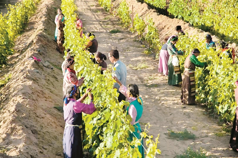 圖為曲水才納凈土健康產(chǎn)業(yè)園內(nèi),當?shù)剞r(nóng)牧民群眾正在葡萄種植基地內(nèi)忙碌。 拉薩融媒記者 王 雪攝