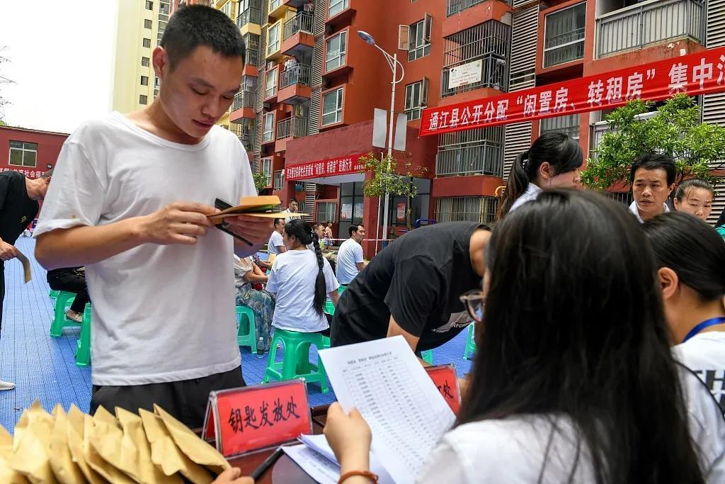 2021年6月,四川省巴中市通江縣公租房民生家園,工作人員為居民發(fā)放鑰匙。
