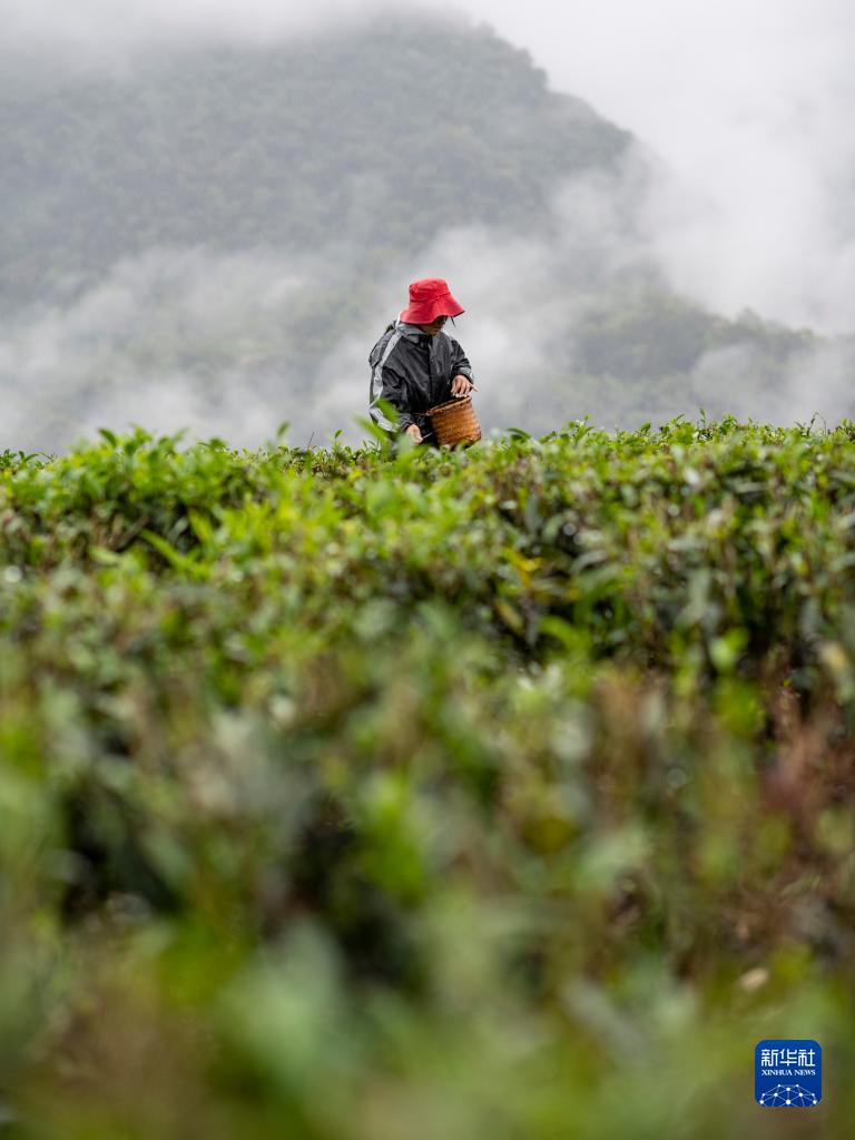 門巴族姑娘貢桑拉姆正在云霧繚繞的茶園里采摘茶青
