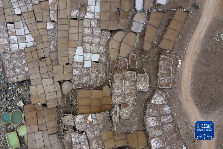加達村村民在古鹽田里勞作(無人機照片,5月26日攝)。新華社記者 周荻瀟 攝