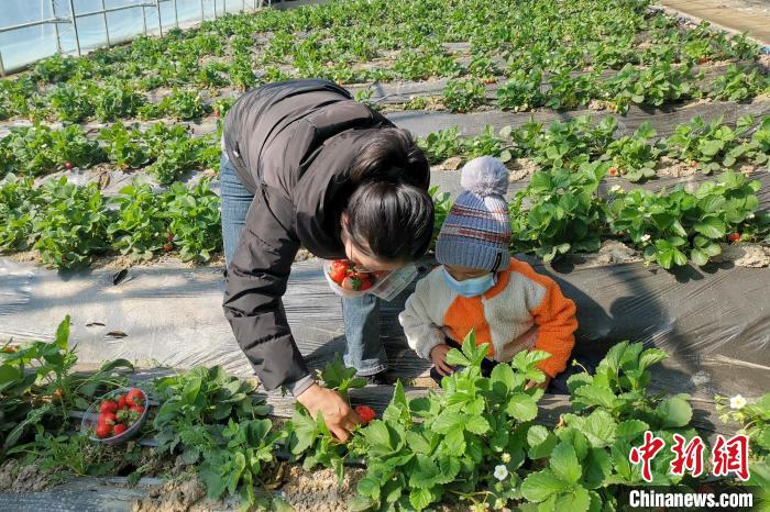 家長帶孩子體驗草莓采摘。 張玉祥 攝