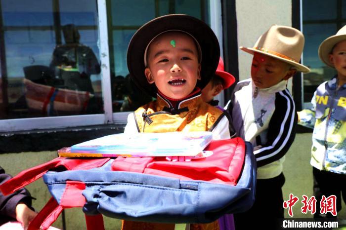 圖為普瑪江塘鄉(xiāng)小學(xué)生領(lǐng)取書包等學(xué)習(xí)用具。 浪卡子縣網(wǎng)信辦供圖