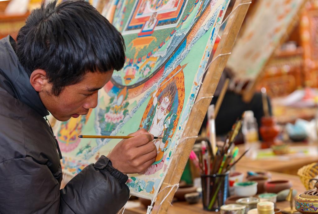 桑珠羅布在為唐卡上色(1月11日攝)。新華社記者 姜帆 攝