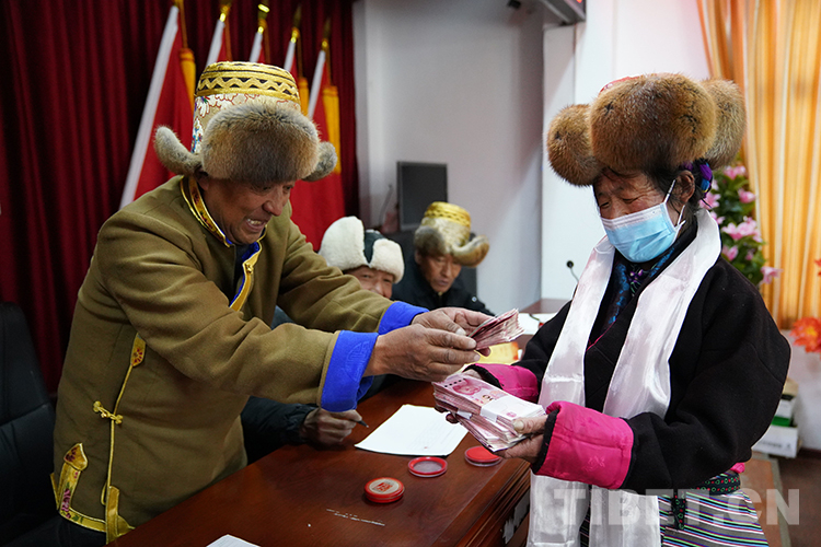 “普布達(dá)桑44565元、多吉扎西38750元、加央卓瑪2000元……”被叫到名字的村民和放牧員們紛紛上前領(lǐng)取入股后的第一次分紅。當(dāng)天牧場為12名放牧員和入股的102戶村民共發(fā)放了64.65萬元的薪資和分紅款。