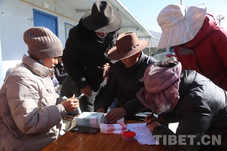 圖為工作人員正在發(fā)放分紅款 攝影:白瑪論珠