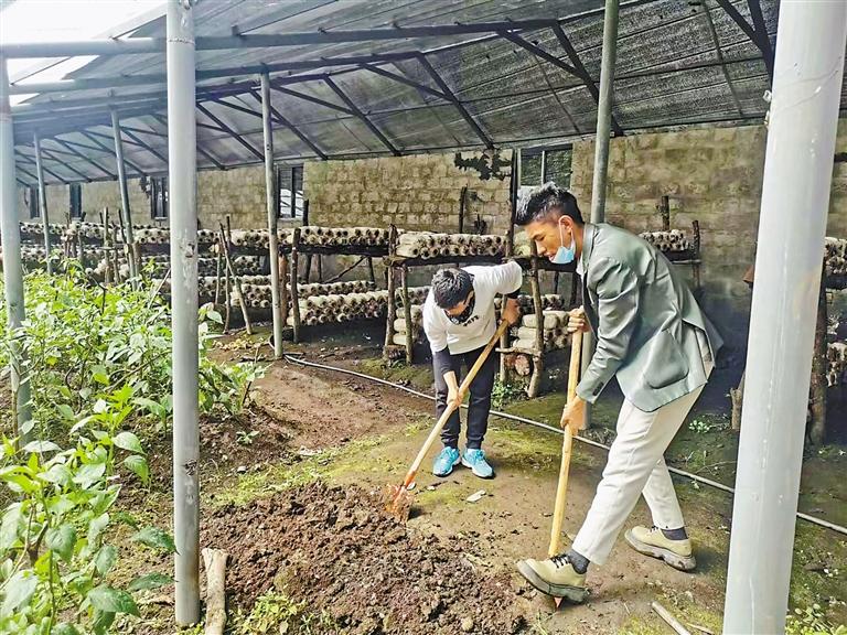 圖為莎列村團支部書記米瑪(右)在溫室翻地栽苗。