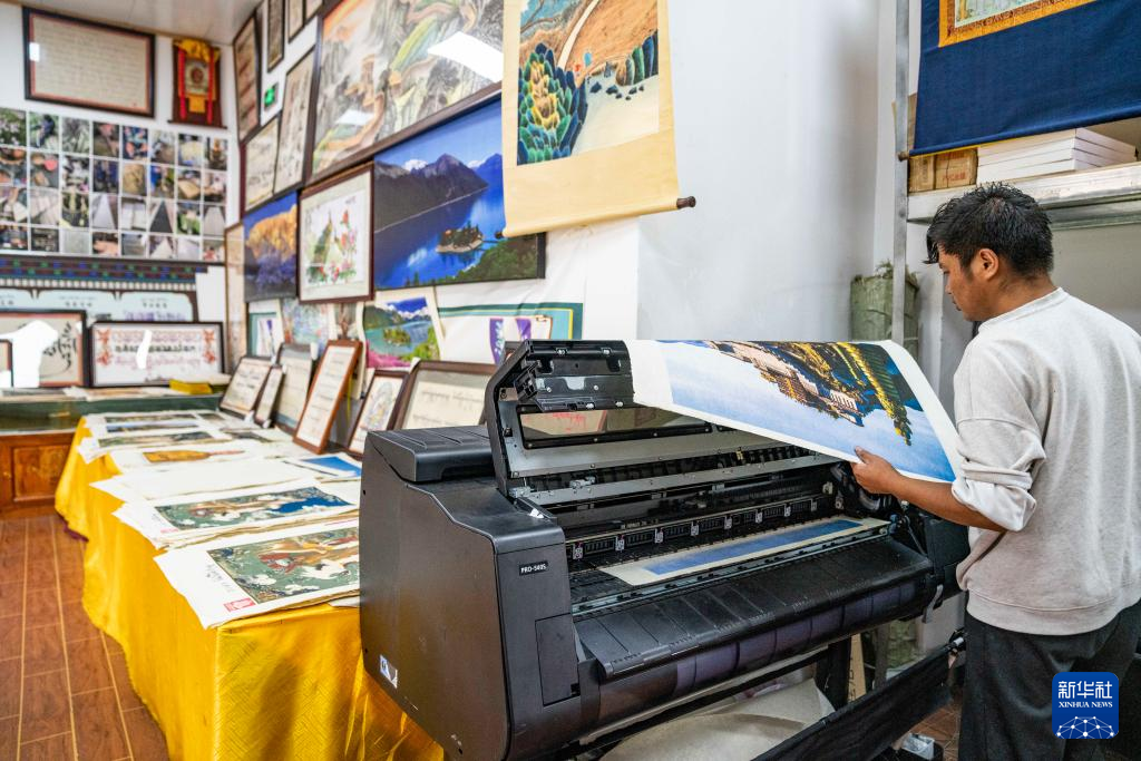 在西藏米林市羌納鄉(xiāng)西嘎門巴村,南迦巴瓦童螺嘎布工藝品農(nóng)民專業(yè)合作社的工作人員在藏紙上印刷圖案(7月26日攝)。新華社記者 孫非 攝