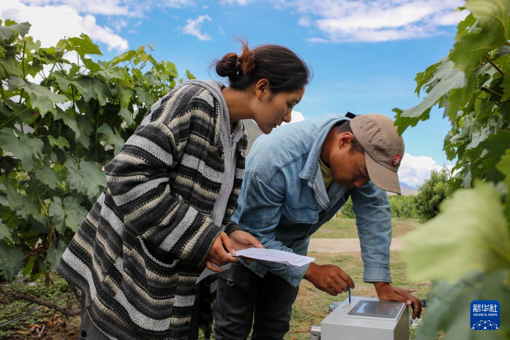7月26日,桑日縣一家葡萄酒企業(yè)的員工曲珍(左)在葡萄園里向技術(shù)員何志榮學(xué)習(xí)操作光譜儀。新華社記者 姜帆 攝