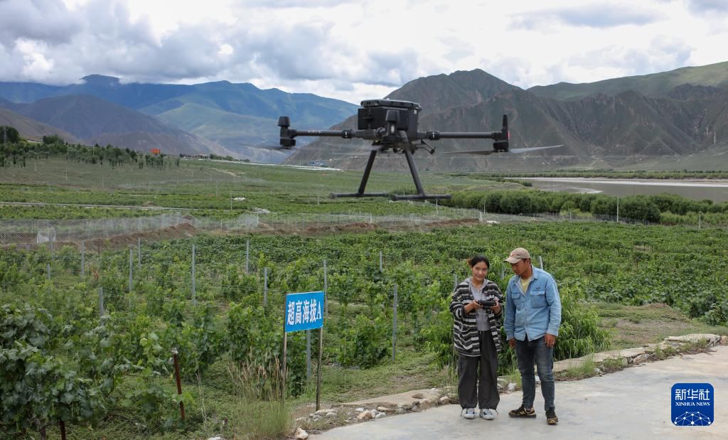 7月26日,桑日縣一家葡萄酒企業(yè)的員工曲珍(左)在葡萄園里向技術(shù)員何志榮學(xué)習(xí)使用農(nóng)用無人機。新華社記者 姜帆 攝